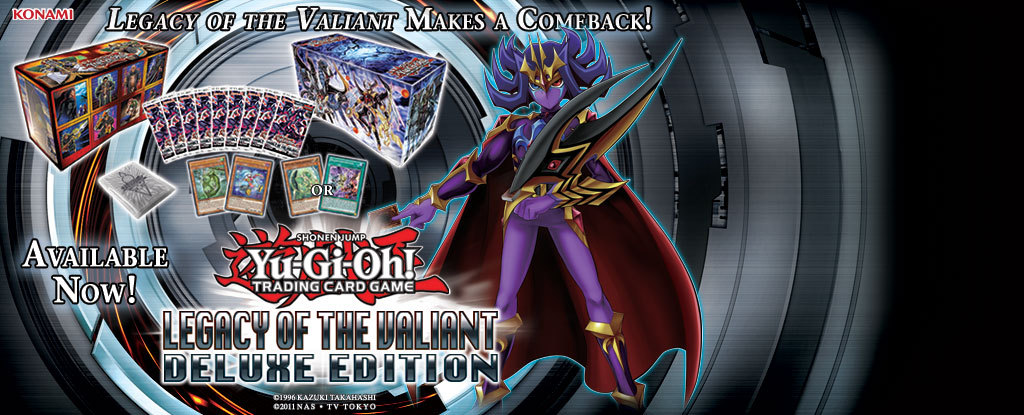 Duelists rejoice: Legacy of the Valiant makes a comeback with Legacy of the Valiant: Deluxe Edition! The powerful January release returns once more to give Duelists a second chance at getting their hands on Chronomaly, Bujin, Monarchs, Ghostricks, and Gravekeepers! Each Legacy of the Valiant: Deluxe Edition comes with NINE Legacy of the Valiant Booster Packs. That’s not all – included are 2 foil versions of Common and/or Rare cards from Legacy of the Valiant, 1 pack of 50 promotional sleeves, and best of all 1 of 2 foil version preview cards from the next Yu-Gi-Oh! TRADING CARD GAME Booster Primal Origin!!! These cards will be legal to play with upon the release of the Legacy of the Valiant: Deluxe Edition.